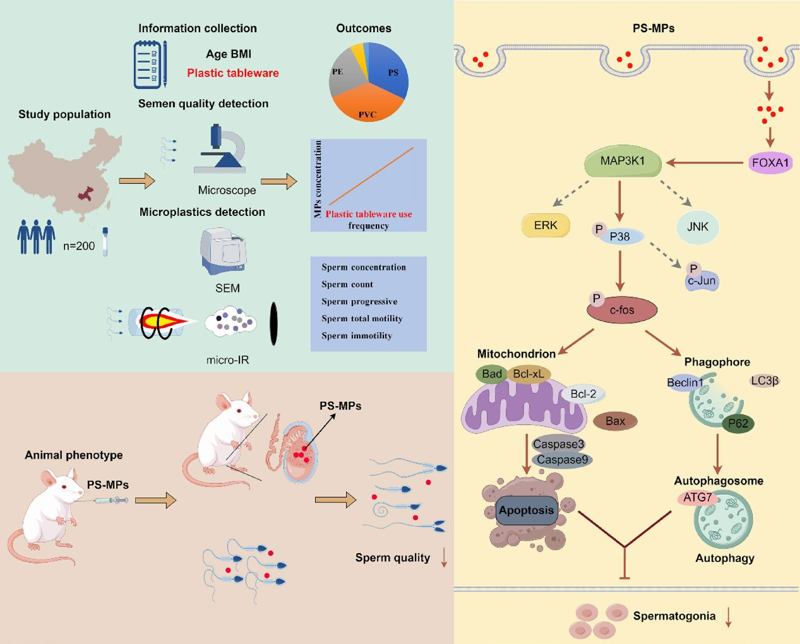 ?分子通路?:PS微塑料通過激活?FOXA1/MAP3K1/p38信號通路?,導致精子前體細胞(精原細胞)過度自噬和凋亡,最終影響精子質量。
