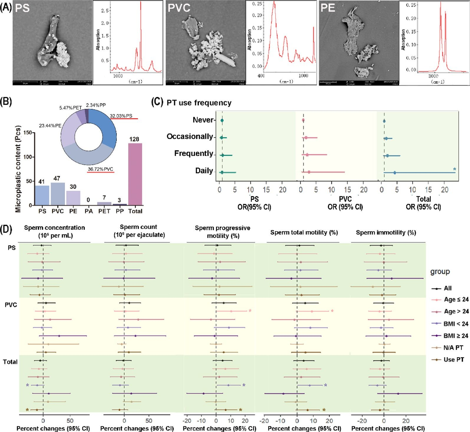 ?微塑料在精液中的普遍性?:檢測200名男性精液樣本,55.5%檢出微塑料,主要成分是?聚苯乙烯(PS)和聚氯乙烯(PVC)?(分別占32%和37%)。?塑料餐具使用頻率越高?,精液中微塑料含量也越高。