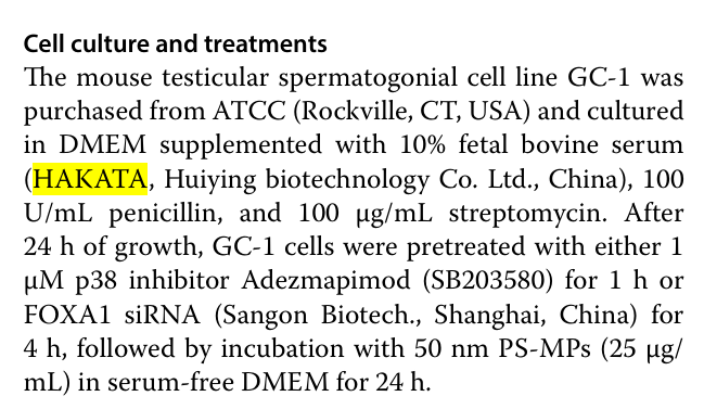 文獻中提到的?GC-1細胞(小鼠精原細胞)培養?使用了HAKATA提供的?胎牛血清?(DMEM培養基中添加10% HAKATA胎牛血清)。這部分實驗支撐了微塑料對生殖細胞毒性的結論,說明HAKATA的產品在基礎研究中發揮了重要作用。